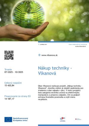 V rámci výzvy PSK-MZP-009-2024-DV-EFRR, Program Slovensko 2021-2027, spolufinancovaný Európskym fondom regionálneho rozvoja sme pre projekt Nákup techniky - Vlkanová, kód projektu 401202FKR8, získali nenávratný finančný príspevok...